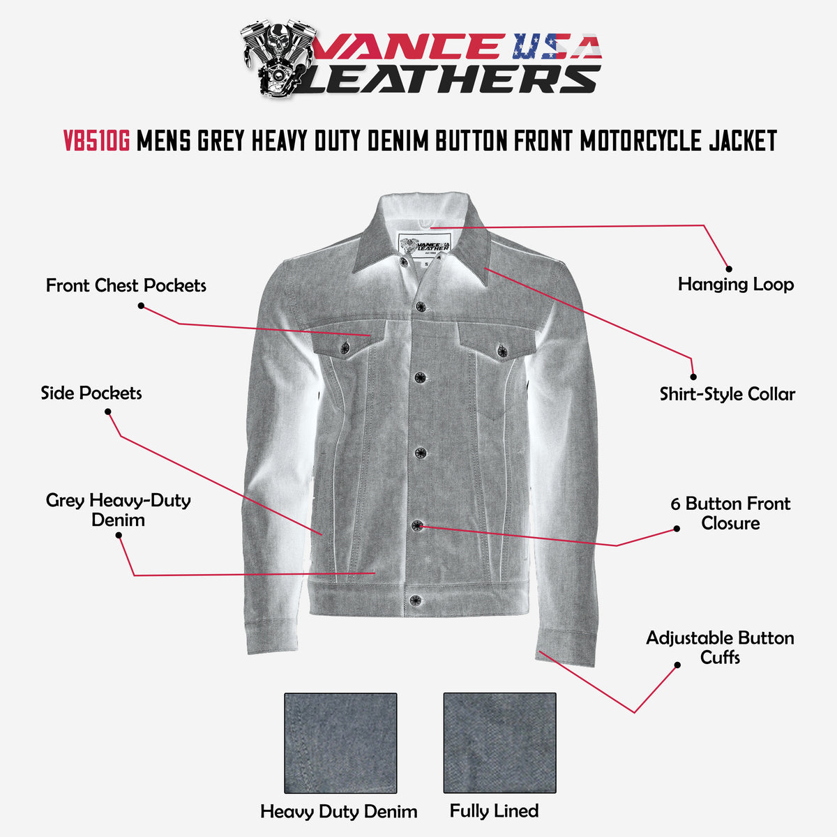 Vance Mens Grey Heavy Duty Denim Button Front Motorcycle Jacket, Jean Jacket for Men