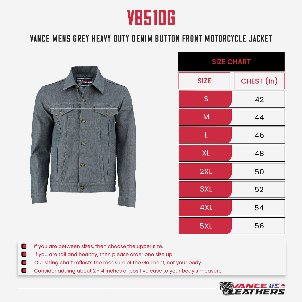 Vance-VB510BK-Mens-Black-Heavy-Duty-Denim-Button-Front-Motorcycle-Jacket-sizechart