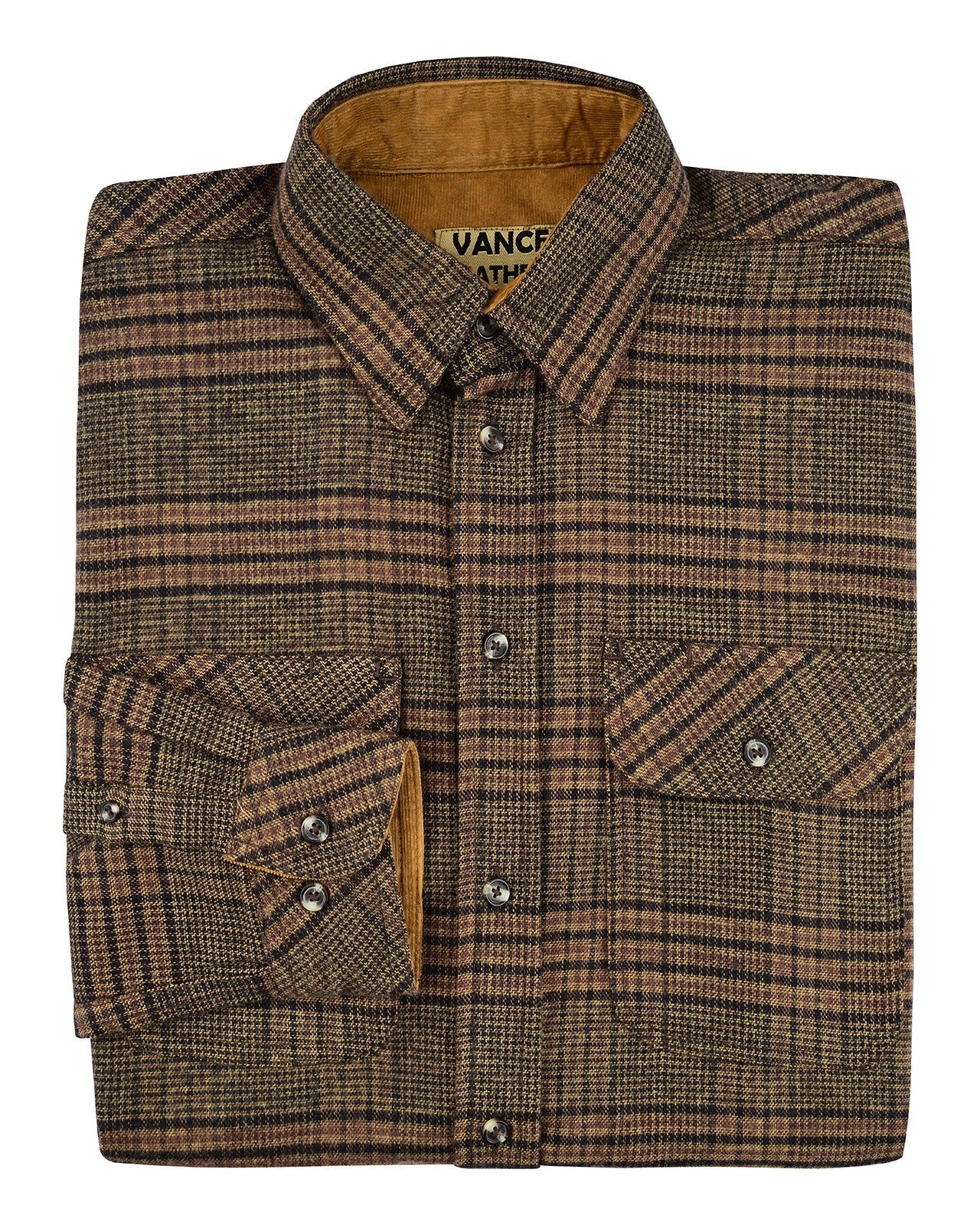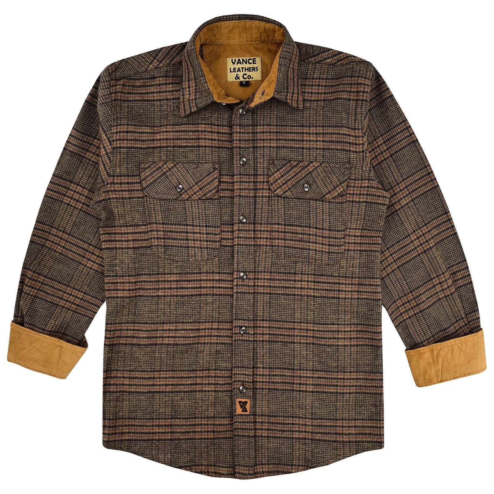 Vance Leather Sequoia Men's Long Sleeve Plaid Button Down Casual Flannel Shirt, Corduroy Cuffs