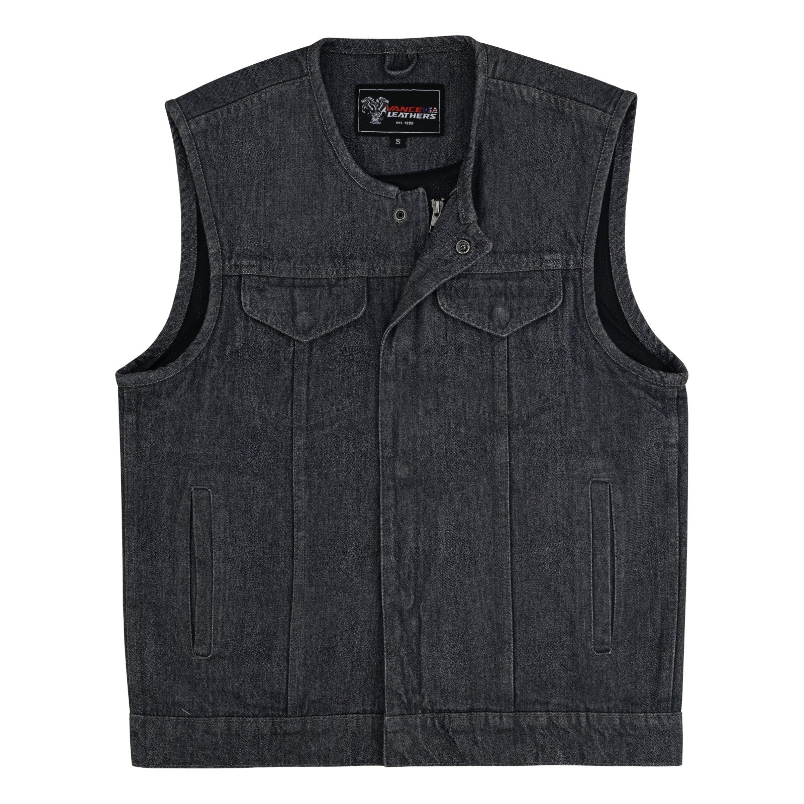 Own the road in the Vance Men's Distressed Grey Denim Motorcycle Club Vest a rugged, rider-ready vest built for bikers who want both style and serious functionality. Whether you're rolling into a rally, cruising on the highway, or repping your club, this collarless denim vest delivers the classic biker look with modern, practical upgrades.